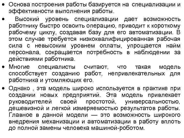 Основа построения работы базируется на специализации и эффективности выполнения работы. Высокий уровень специализации дает возможность работнику быстро освоить операцию, приводит к короткому рабочему циклу, создавая базу для его автоматизации. В этом случае требуется низкоквалифицированная рабочая сила с невысоким уровнем оплаты, упрощается найм персонала, сокращается потребность в наблюдении за действиями работника. Многие специалисты считают, что такая модель способствует созданию работ, непривлекательных для работника и утомляющих его. Однако , эта модель широко используется в практике при создании новых предприятий. Эта модель привлекает руководителей своей простотой, универсальностью, дешевизной и легкой измеряемостью результатов работы. Главное в данной модели — это возможность широкого внедрения механизации и автоматизации в работу вплоть до полной замены человека машиной роботом.