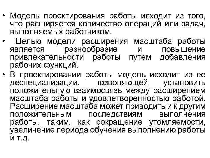• Модель проектирования работы исходит из того, что расширяется количество операций или задач, выполняемых работником. • Целью модели расширения масштаба работы является разнообразие и повышение привлекательности работы путем добавления рабочих функций. • В проектировании работы модель исходит из ее деспециализации, позволяющей установить положительную взаимосвязь между расширением масштаба работы и удовлетворенностью работой. Расширение масштаба может приводить и к другим положительным последствиям выполнения работы, таким, как сокращение утомляемости, увеличение периода обучения выполнению работы и т. д.