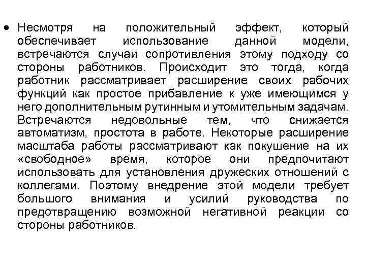 Несмотря на положительный эффект, который обеспечивает использование данной модели, встречаются случаи сопротивления этому подходу со стороны работников. Происходит это тогда, когда работник рассматривает расширение своих рабочих функций как простое прибавление к уже имеющимся у него дополнительным рутинным и утомительным задачам. Встречаются недовольные тем, что снижается автоматизм, простота в работе. Некоторые расширение масштаба работы рассматривают как покушение на их «свободное» время, которое они предпочитают использовать для установления дружеских отношений с коллегами. Поэтому внедрение этой модели требует большого внимания и усилий руководства по предотвращению возможной негативной реакции со стороны работников.