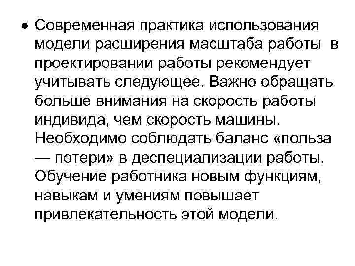 Современная практика использования модели расширения масштаба работы в проектировании работы рекомендует учитывать следующее. Важно обращать больше внимания на скорость работы индивида, чем скорость машины. Необходимо соблюдать баланс «польза — потери» в деспециализации работы. Обучение работника новым функциям, навыкам и умениям повышает привлекательность этой модели.