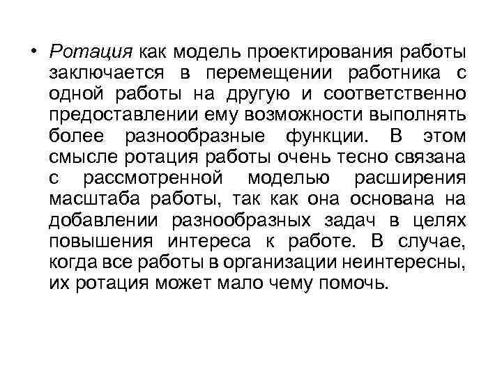 • Ротация как модель проектирования работы заключается в перемещении работника с одной работы на другую и соответственно предоставлении ему возможности выполнять более разнообразные функции. В этом смысле ротация работы очень тесно связана с рассмотренной моделью расширения масштаба работы, так как она основана на добавлении разнообразных задач в целях повышения интереса к работе. В случае, когда все работы в организации неинтересны, их ротация может мало чему помочь.