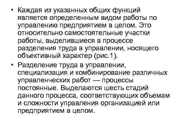 • Каждая из указанных общих функций является определенным видом работы по управлению предприятием в целом. Это относительно самостоятельные участки работы, выделившиеся в процессе разделения труда в управлении, носящего объективный характер (рис. 1). • Разделение труда в управлении, специализация и комбинирование различных управленческих работ — процессы постоянные. Выделаются шесть стадий данного процесса, соответствующих объемам и сложности управления организацией или предприятием в целом.