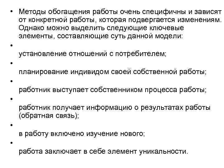 • Методы обогащения работы очень специфичны и зависят от конкретной работы, которая подвергается изменениям. Однако можно выделить следующие ключевые элементы, составляющие суть данной модели: • установление отношений с потребителем; • планирование индивидом своей собственной работы; • работник выступает собственником процесса работы; • работник получает информацию о результатах работы (обратная связь); • в работу включено изучение нового; • работа заключает в себе элемент уникальности.