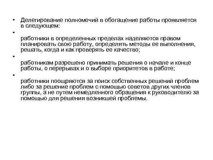 • Делегирование полномочий в обогащение работы проявляется в следующем: • работники в определенных пределах наделяются правом планировать свою работу, определять методы ее выполнения, решать, когда и как проверять ее качество; • работникам разрешено принимать решения о начале и конце работы, о перерывах и о выборе приоритетов в работе; • работники поощряются за поиск собственных решений проблем либо за решение проблем с помощью советов других членов группы, а не путем немедленного обращения к руководителю за помощью для решения возникшей проблемы.