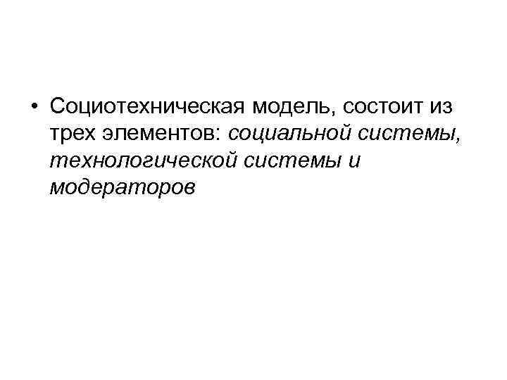 • Социотехническая модель, состоит из трех элементов: социальной системы, технологической системы и модераторов