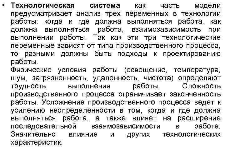 • Технологическая система как часть модели предусматривает анализ трех переменных в технологии работы: когда и где должна выполняться работа, как должна выполняться работа, взаимозависимость при выполнении работы. Так как эти три технологические переменные зависят от типа производственного процесса, то разными должны быть подходы к проектированию работы. Физические условия работы (освещение, температура, шум, загрязненность, удаленность, чистота) определяют трудность выполнения работы. Сложность производственного процесса ограничивает законченность работы. Усложнение производственного процесса ведет к усилению неопределенности в том, когда и где должна выполняться работа, а также влияет на расширение последовательной взаямозависимости в работе. Значительно влияние и других технологических характеристик.