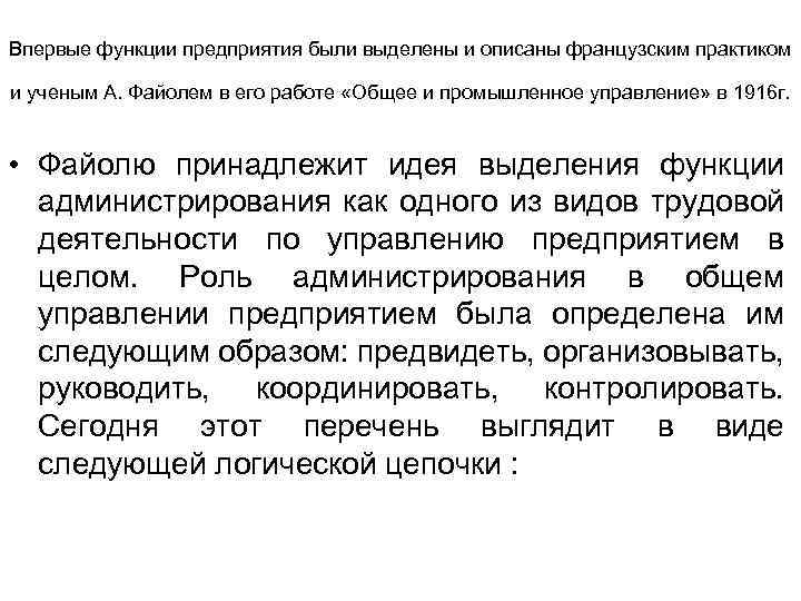 Впервые функции предприятия были выделены и описаны французским практиком и ученым А. Файолем в его работе «Общее и промышленное управление» в 1916 г. • Файолю принадлежит идея выделения функции администрирования как одного из видов трудовой деятельности по управлению предприятием в целом. Роль администрирования в общем управлении предприятием была определена им следующим образом: предвидеть, организовывать, руководить, координировать, контролировать. Сегодня этот перечень выглядит в виде следующей логической цепочки :