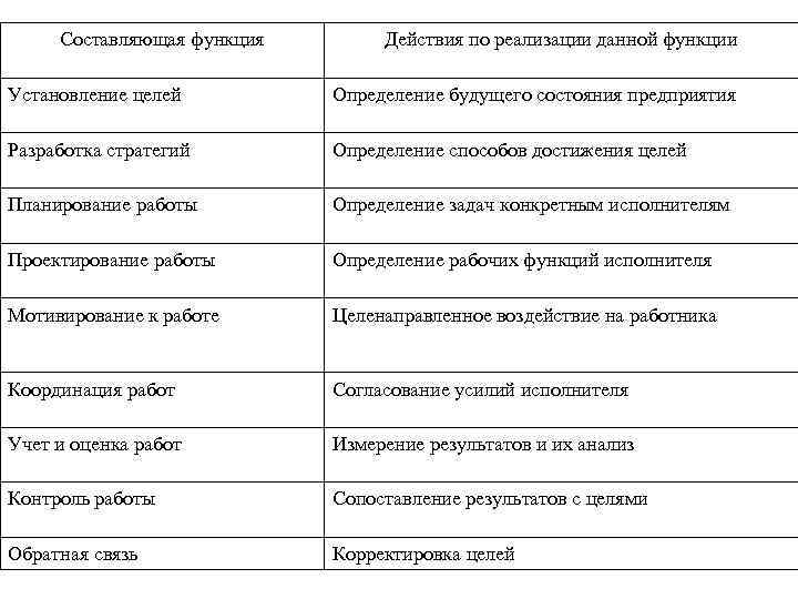 Составляющая функция Действия по реализации данной функции Установление целей Определение будущего состояния предприятия Разработка стратегий Определение способов достижения целей Планирование работы Определение задач конкретным исполнителям Проектирование работы Определение рабочих функций исполнителя Мотивирование к работе Целенаправленное воздействие на работника Координация работ Согласование усилий исполнителя Учет и оценка работ Измерение результатов и их анализ Контроль работы Сопоставление результатов с целями Обратная связь Корректировка целей