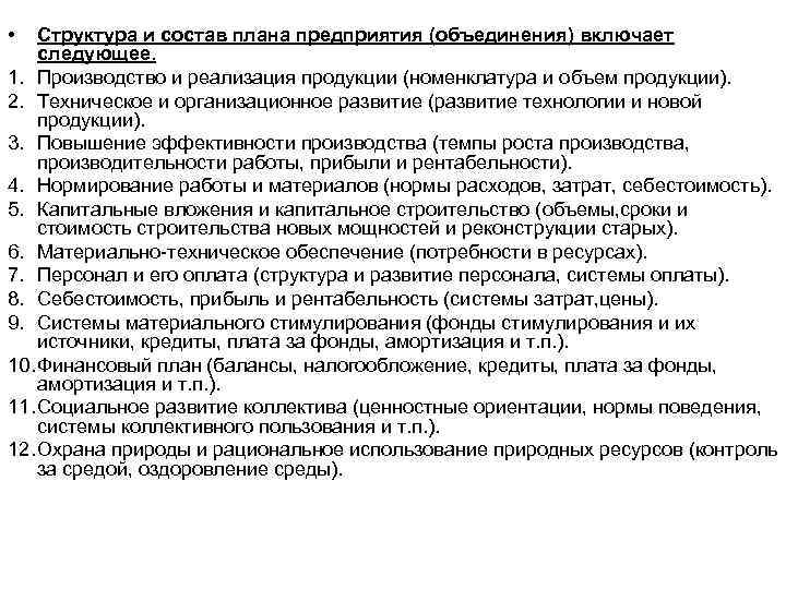 • Структура и состав плана предприятия (объединения) включает следующее. 1. Производство и реализация продукции (номенклатура и объем продукции). 2. Техническое и организационное развитие (развитие технологии и новой продукции). 3. Повышение эффективности производства (темпы роста производства, производительности работы, прибыли и рентабельности). 4. Нормирование работы и материалов (нормы расходов, затрат, себестоимость). 5. Капитальные вложения и капитальное строительство (объемы, сроки и стоимость строительства новых мощностей и реконструкции старых). 6. Материально техническое обеспечение (потребности в ресурсах). 7. Персонал и его оплата (структура и развитие персонала, системы оплаты). 8. Себестоимость, прибыль и рентабельность (системы затрат, цены). 9. Системы материального стимулирования (фонды стимулирования и их источники, кредиты, плата за фонды, амортизация и т. п. ). 10. Финансовый план (балансы, налогообложение, кредиты, плата за фонды, амортизация и т. п. ). 11. Социальное развитие коллектива (ценностные ориентации, нормы поведения, системы коллективного пользования и т. п. ). 12. Охрана природы и рациональное использование природных ресурсов (контроль за средой, оздоровление среды).