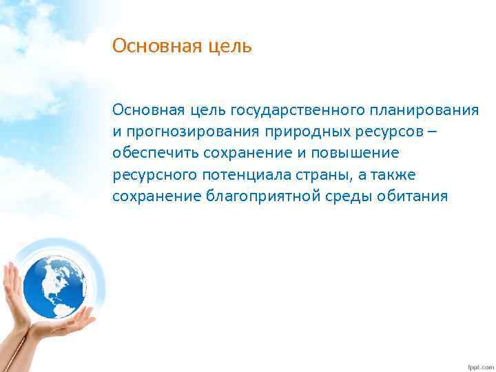 Основная цель государственного планирования и прогнозирования природных ресурсов – обеспечить сохранение и повышение ресурсного потенциала страны, а также сохранение благоприятной среды обитания