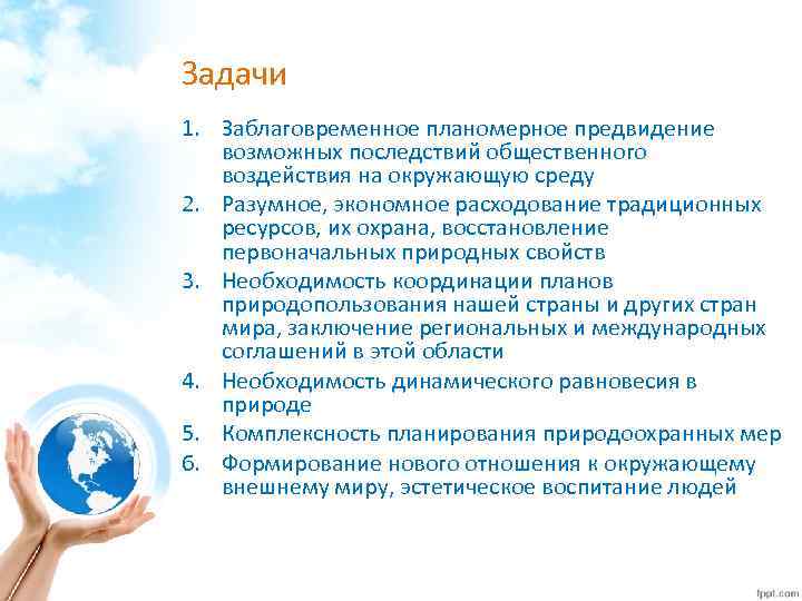 Задачи 1. Заблаговременное планомерное предвидение возможных последствий общественного воздействия на окружающую среду 2. Разумное, экономное расходование традиционных ресурсов, их охрана, восстановление первоначальных природных свойств 3. Необходимость координации планов природопользования нашей страны и других стран мира, заключение региональных и международных соглашений в этой области 4. Необходимость динамического равновесия в природе 5. Комплексность планирования природоохранных мер 6. Формирование нового отношения к окружающему внешнему миру, эстетическое воспитание людей