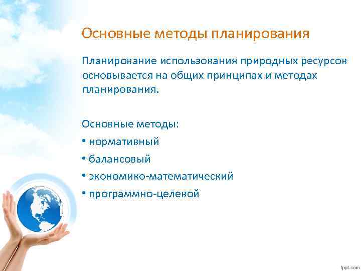 Основные методы планирования Планирование использования природных ресурсов основывается на общих принципах и методах планирования. Основные методы: • нормативный • балансовый • экономико-математический • программно-целевой