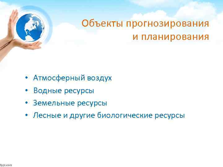 Объекты прогнозирования и планирования • • Атмосферный воздух Водные ресурсы Земельные ресурсы Лесные и другие биологические ресурсы