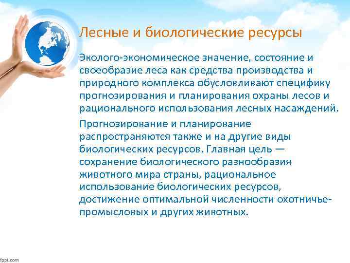 Лесные и биологические ресурсы Эколого-экономическое значение, состояние и своеобразие леса как средства производства и природного комплекса обусловливают специфику прогнозирования и планирования охраны лесов и рационального использования лесных насаждений. Прогнозирование и планирование распространяются также и на другие виды биологических ресурсов. Главная цель — сохранение биологического разнообразия животного мира страны, рациональное использование биологических ресурсов, достижение оптимальной численности охотничьепромысловых и других животных.
