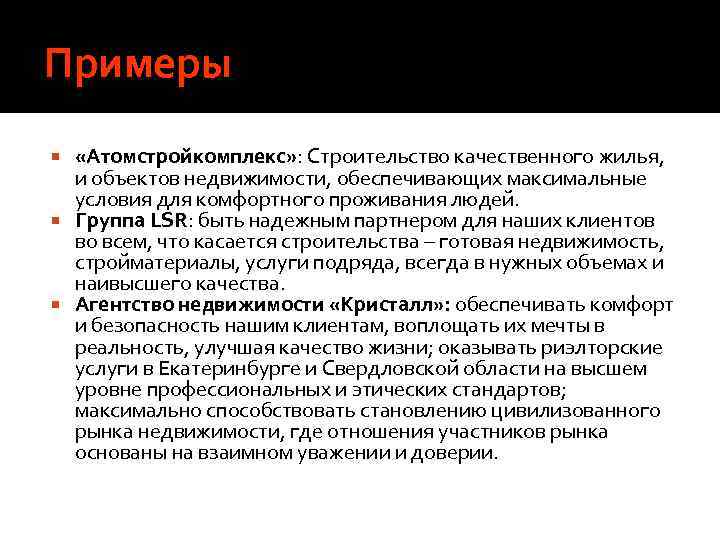 Примеры «Атомстройкомплекс» : Строительство качественного жилья, и объектов недвижимости, обеспечивающих максимальные условия для комфортного проживания людей. Группа LSR: быть надежным партнером для наших клиентов во всем, что касается строительства – готовая недвижимость, стройматериалы, услуги подряда, всегда в нужных объемах и наивысшего качества. Агентство недвижимости «Кристалл» : обеспечивать комфорт и безопасность нашим клиентам, воплощать их мечты в реальность, улучшая качество жизни; оказывать риэлторские услуги в Екатеринбурге и Свердловской области на высшем уровне профессиональных и этических стандартов; максимально способствовать становлению цивилизованного рынка недвижимости, где отношения участников рынка основаны на взаимном уважении и доверии.