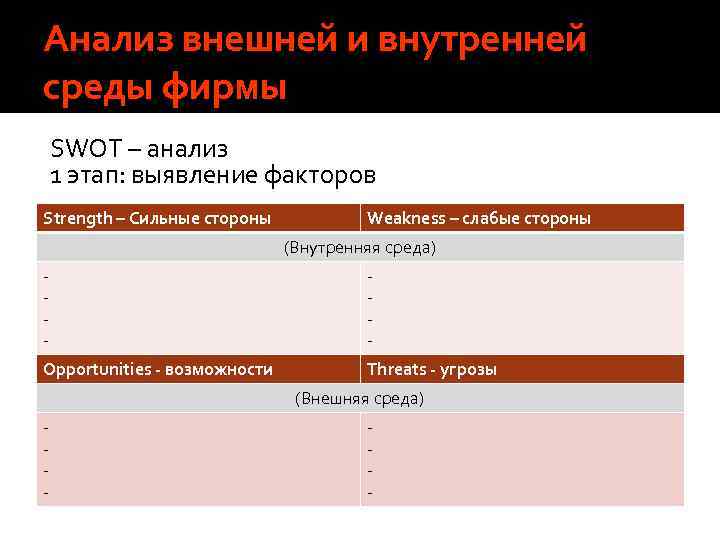 Анализ внешней и внутренней среды фирмы SWOT – анализ 1 этап: выявление факторов Strength – Сильные стороны Weakness – слабые стороны (Внутренняя среда) - - Opportunities - возможности Threats - угрозы (Внешняя среда) - -