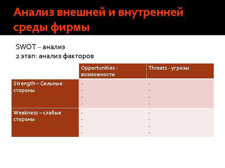 Анализ внешней и внутренней среды фирмы SWOT – анализ 2 этап: анализ факторов Opportunities возможности Threats - угрозы Strength – Сильные стороны - - Weakness – слабые стороны - -