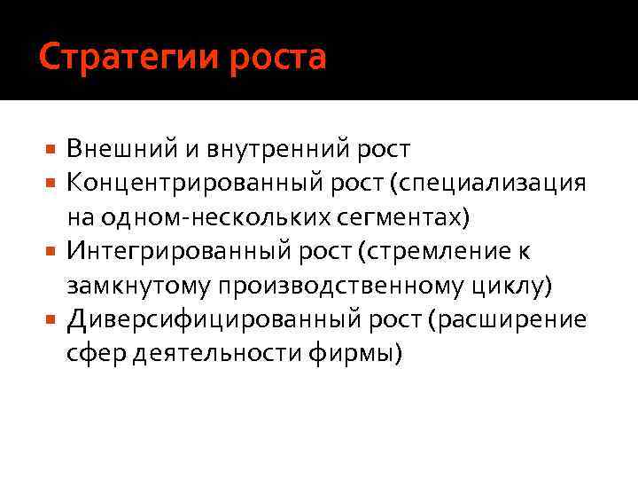 Стратегии роста Внешний и внутренний рост Концентрированный рост (специализация на одном-нескольких сегментах) Интегрированный рост (стремление к замкнутому производственному циклу) Диверсифицированный рост (расширение сфер деятельности фирмы)