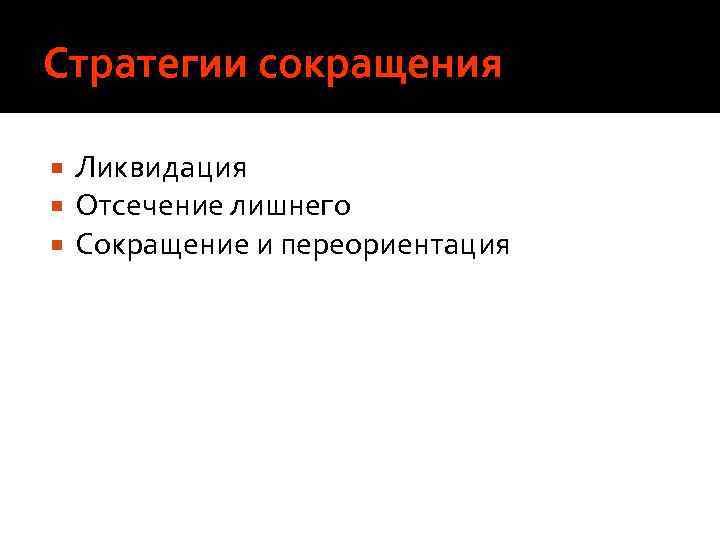 Стратегии сокращения Ликвидация Отсечение лишнего Сокращение и переориентация