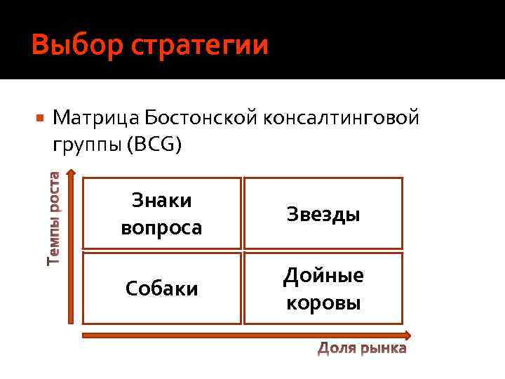 Выбор стратегии Матрица Бостонской консалтинговой группы (BCG) Знаки вопроса Звезды Собаки Дойные коровы