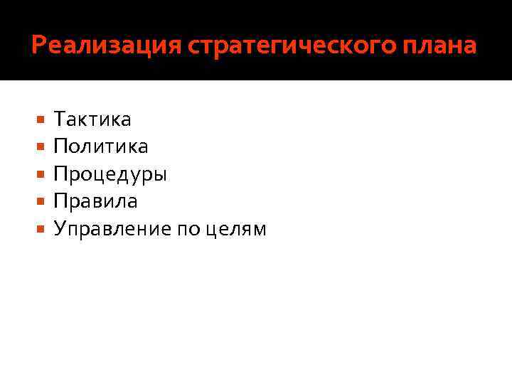 Реализация стратегического плана Тактика Политика Процедуры Правила Управление по целям