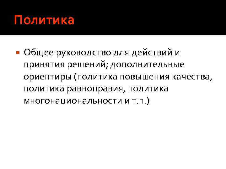 Политика Общее руководство для действий и принятия решений; дополнительные ориентиры (политика повышения качества, политика равноправия, политика многонациональности и т. п. )