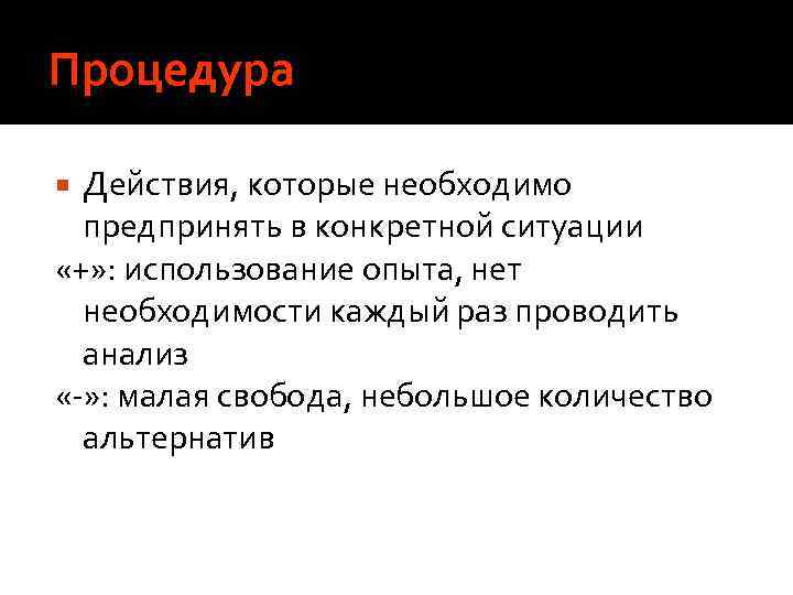 Процедура Действия, которые необходимо предпринять в конкретной ситуации «+» : использование опыта, нет необходимости каждый раз проводить анализ «-» : малая свобода, небольшое количество альтернатив