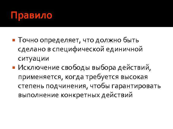 Правило Точно определяет, что должно быть сделано в специфической единичной ситуации Исключение свободы выбора действий, применяется, когда требуется высокая степень подчинения, чтобы гарантировать выполнение конкретных действий