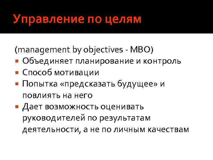 Управление по целям (management by objectives - MBO) Объединяет планирование и контроль Способ мотивации Попытка «предсказать будущее» и повлиять на него Дает возможность оценивать руководителей по результатам деятельности, а не по личным качествам