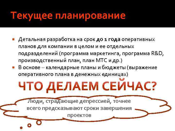 Текущее планирование Детальная разработка на срок до 1 года оперативных планов для компании в целом и ее отдельных подразделений (программа маркетинга, программа R&D, производственный план, план МТС и др. ) В основе – календарные планы и бюджеты (выражение оперативного плана в денежных единицах) Люди, страдающие депрессией, точнее всего предсказывают сроки завершения проектов
