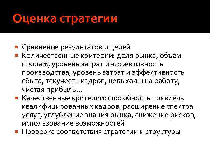 Оценка стратегии Сравнение результатов и целей Количественные критерии: доля рынка, объем продаж, уровень затрат и эффективность производства, уровень затрат и эффективность сбыта, текучесть кадров, невыходы на работу, чистая прибыль… Качественные критерии: способность привлечь квалифицированных кадров, расширение спектра услуг, углубление знания рынка, снижение рисков, использование возможностей Проверка соответствия стратегии и структуры