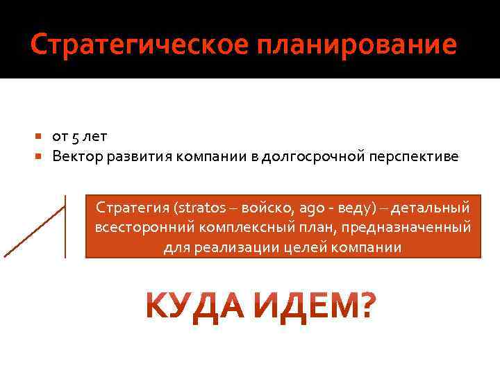 Стратегическое планирование от 5 лет Вектор развития компании в долгосрочной перспективе Стратегия (stratos – войско, ago - веду) – детальный всесторонний комплексный план, предназначенный для реализации целей компании
