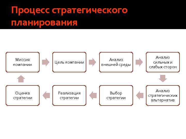Процесс стратегического планирования Миссия компании Оценка стратегии Цель компании Анализ внешней среды Анализ сильных и слабых сторон Реализация стратегии Выбор стратегии Анализ стратегических альтернатив