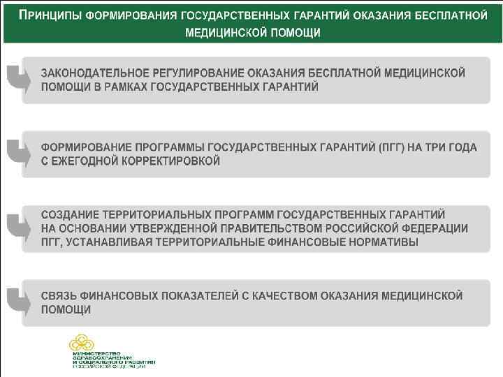 Программа государственных гарантий оказания гражданам Российской Федерации бесплатной медицинской помощи u Реализует на практике основные принципы, виды и методы перспективного планирования в здравоохранении