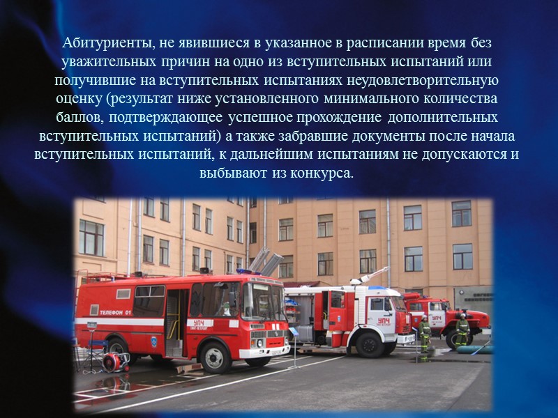 Абитуриенты, не явившиеся в указанное в расписании время без уважительных причин на одно из вступительных испытаний или получившие на вступительных испытаниях неудовлетворительную оценку (результат ниже установленного минимального количества баллов, подтверждающее успешное прохождение дополнительных вступительных испытаний) а также забравшие документы после начала вступительных испытаний, к дальнейшим испытаниям не допускаются и выбывают из конкурса.