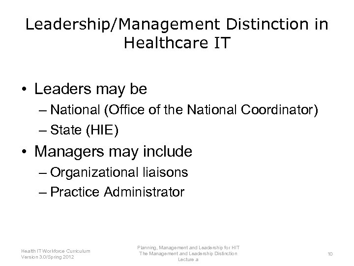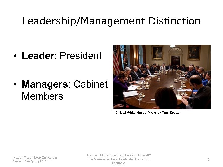 Leadership/Management Distinction • Leader: President • Managers: Cabinet Members Official White House Photo by Pete Souza Planning, Management and Leadership for HIT Health IT Workforce Curriculum The Management and Leadership Distinction 9 Version 3. 0/Spring 2012 Lecture a