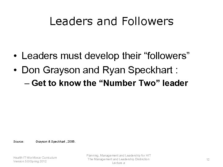 Leaders and Followers • Leaders must develop their “followers” Source: Tu, et al. , 2009. Planning, Management and Leadership for HIT Health IT Workforce Curriculum The Management and Leadership Distinction 11 Version 3. 0/Spring 2012 Lecture a