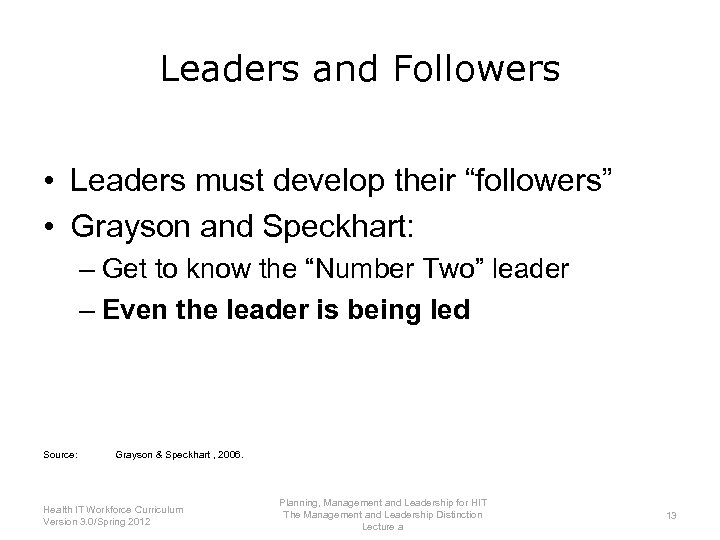 Leaders and Followers • Leaders must develop their “followers” • Don Grayson and Ryan Speckhart : – Get to know the “Number Two” leader Source: Grayson & Speckhart , 2006. Planning, Management and Leadership for HIT Health IT Workforce Curriculum The Management and Leadership Distinction 12 Version 3. 0/Spring 2012 Lecture a