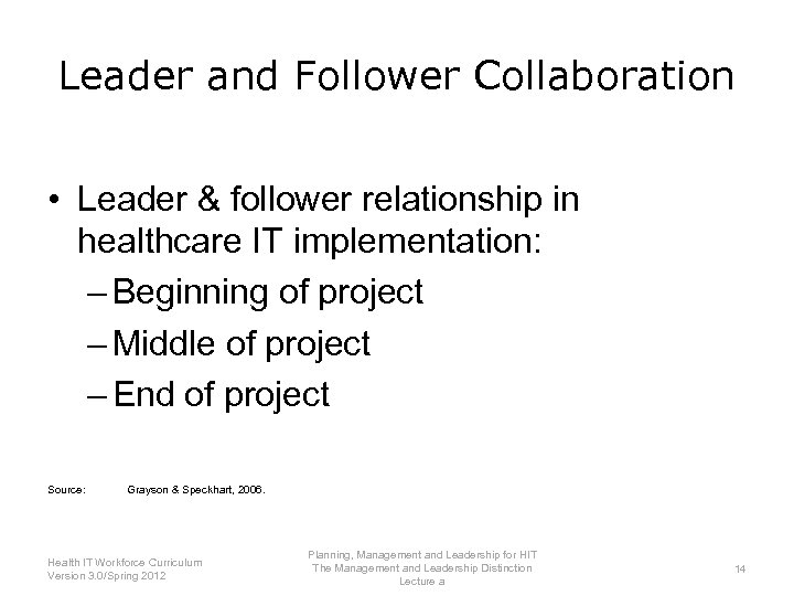 Leaders and Followers • Leaders must develop their “followers” • Grayson and Speckhart: – Get to know the “Number Two” leader – Even the leader is being led Source: Grayson & Speckhart , 2006. Planning, Management and Leadership for HIT Health IT Workforce Curriculum The Management and Leadership Distinction 13 Version 3. 0/Spring 2012 Lecture a