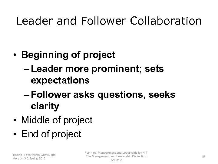 Leader and Follower Collaboration • Leader & follower relationship in healthcare IT implementation: – Beginning of project – Middle of project – End of project Source: Grayson & Speckhart, 2006. Planning, Management and Leadership for HIT Health IT Workforce Curriculum The Management and Leadership Distinction 14 Version 3. 0/Spring 2012 Lecture a