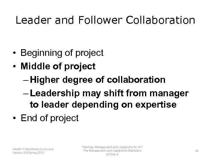 Leader and Follower Collaboration • Beginning of project – Leader more prominent; sets expectations – Follower asks questions, seeks clarity • Middle of project • End of project Planning, Management and Leadership for HIT Health IT Workforce Curriculum The Management and Leadership Distinction 15 Version 3. 0/Spring 2012 Lecture a