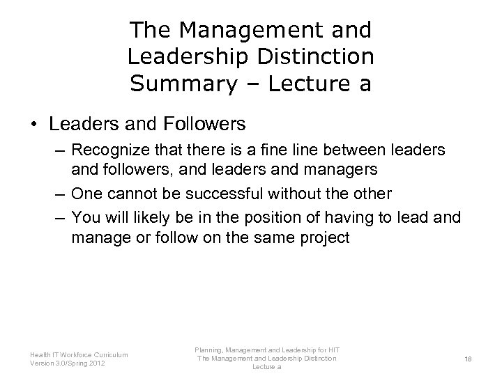 The Management and Leadership Distinction Summary – Lecture a • Leaders and Followers – Recognize that there is a fine line between leaders and followers, and leaders and managers – One cannot be successful without the other – You will likely be in the position of having to lead and manage or follow on the same project Planning, Management and Leadership for HIT Health IT Workforce Curriculum The Management and Leadership Distinction 18 Version 3. 0/Spring 2012 Lecture a
