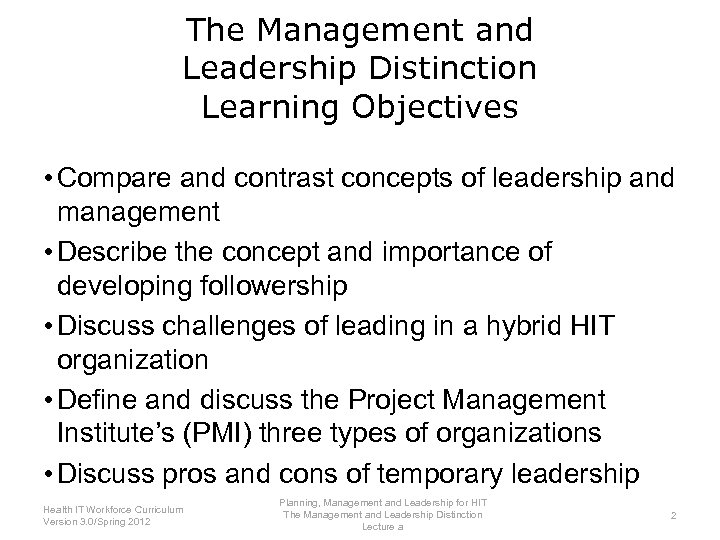 The Management and Leadership Distinction Learning Objectives • Compare and contrast concepts of leadership and management • Describe the concept and importance of developing followership • Discuss challenges of leading in a hybrid HIT organization • Define and discuss the Project Management Institute’s (PMI) three types of organizations • Discuss pros and cons of temporary leadership Planning, Management and Leadership for HIT Health IT Workforce Curriculum The Management and Leadership Distinction 2 Version 3. 0/Spring 2012 Lecture a