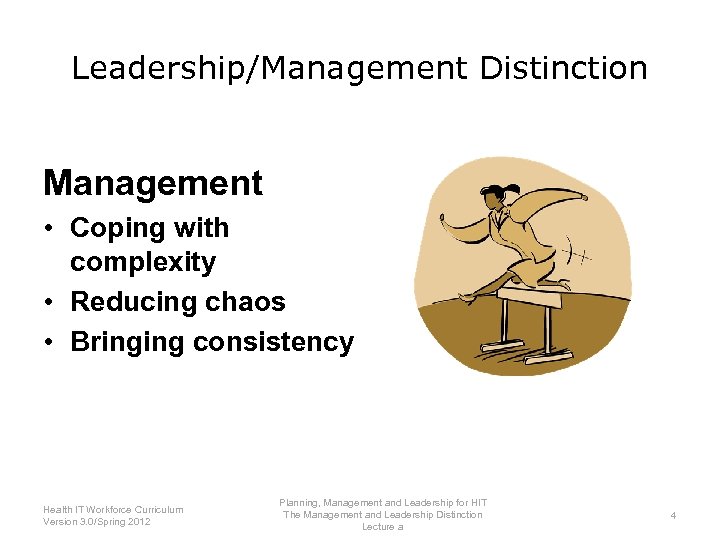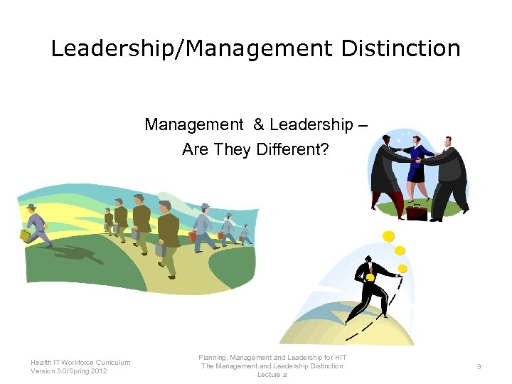 Leadership/Management Distinction Management & Leadership – Are They Different? Planning, Management and Leadership for HIT Health IT Workforce Curriculum The Management and Leadership Distinction 3 Version 3. 0/Spring 2012 Lecture a
