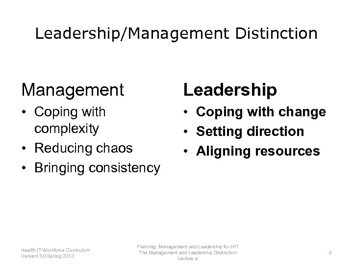 Leadership/Management Distinction Management • Coping with complexity • Reducing chaos • Bringing consistency Planning, Management and Leadership for HIT Health IT Workforce Curriculum The Management and Leadership Distinction 4 Version 3. 0/Spring 2012 Lecture a