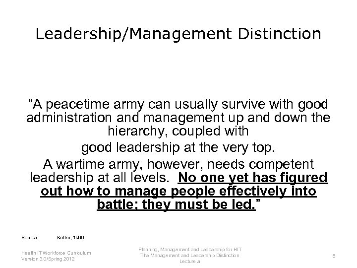Leadership/Management Distinction “A peacetime army can usually survive with good administration and management up and down the hierarchy, coupled with good leadership at the very top. A wartime army, however, needs competent leadership at all levels. No one yet has figured out how to manage people effectively into battle; they must be led. ” Source: Kotter, 1990. Planning, Management and Leadership for HIT Health IT Workforce Curriculum The Management and Leadership Distinction 6 Version 3. 0/Spring 2012 Lecture a
