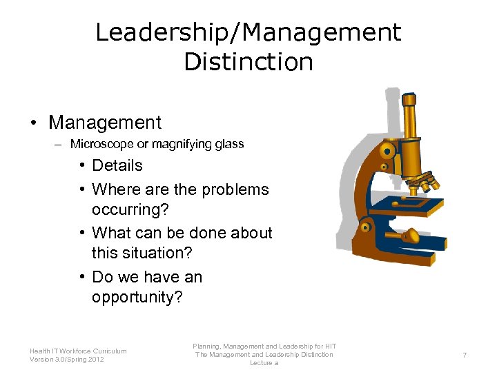 Leadership/Management Distinction • Management – Microscope or magnifying glass • Details • Where are the problems occurring? • What can be done about this situation? • Do we have an opportunity? Planning, Management and Leadership for HIT Health IT Workforce Curriculum The Management and Leadership Distinction 7 Version 3. 0/Spring 2012 Lecture a