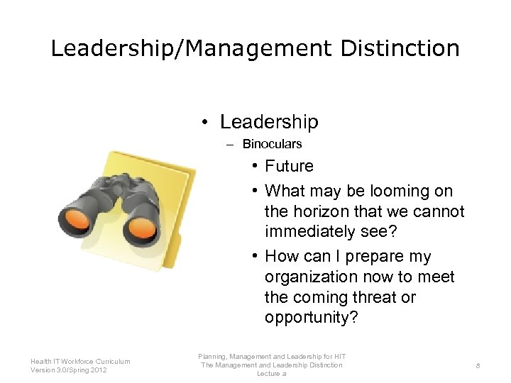Leadership/Management Distinction • Leadership – Binoculars • Future • What may be looming on the horizon that we cannot immediately see? • How can I prepare my organization now to meet the coming threat or opportunity? Planning, Management and Leadership for HIT Health IT Workforce Curriculum The Management and Leadership Distinction 8 Version 3. 0/Spring 2012 Lecture a