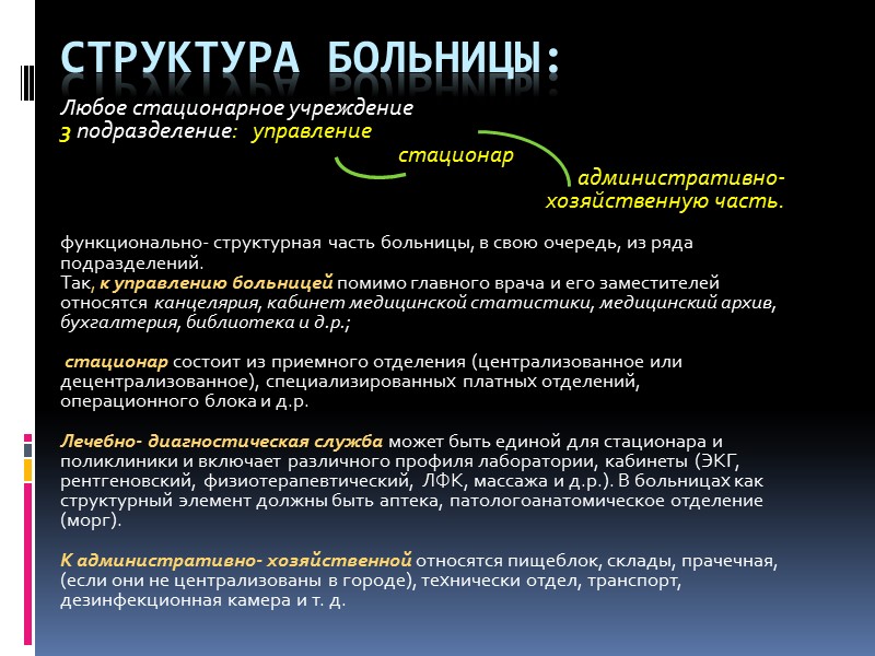 Структура больницы: Любое стационарное учреждение 3 подразделение: управление стационар административно- хозяйственную часть. функционально- структурная часть больницы, в свою очередь, из ряда подразделений. Так, к управлению больницей помимо главного врача и его заместителей относятся канцелярия, кабинет медицинской статистики, медицинский архив, бухгалтерия, библиотека и д.р.; стационар состоит из приемного отделения (централизованное или децентрализованное), специализированных платных отделений, операционного блока и д.р. Лечебно- диагностическая служба может быть единой для стационара и поликлиники и включает различного профиля лаборатории, кабинеты (ЭКГ, рентгеновский, физиотерапевтический, ЛФК, массажа и д.р.). В больницах как структурный элемент должны быть аптека, патологоанатомическое отделение (морг). К административно- хозяйственной относятся пищеблок, склады, прачечная, (если они не централизованы в городе), технически отдел, транспорт, дезинфекционная камера и т. д.