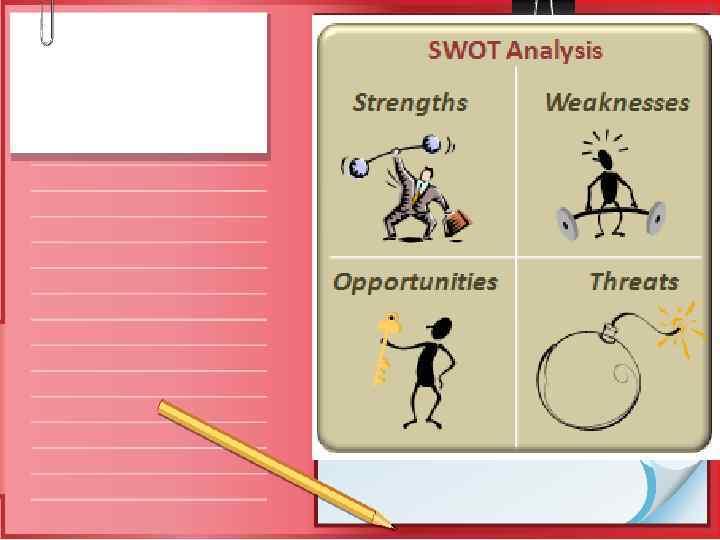Cлабкі сторони • відсутність або недосконалість стратегії; • сильний конкурентний тиск та погіршення конкурентної позиції; • застарі технології та обладнання; • недостатня кваліфікація управлінського та виробничого персоналу; • маркетингові недоліки; • відсутність фінансування для впровадження стратегічних змін; • невідповідність організаційної структури й стратегії тощо.